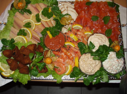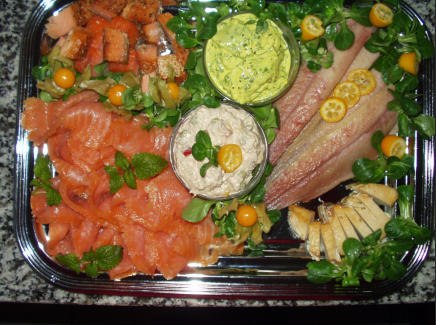 belegen wir nach Ihren Wünschen und Terminenmit Räucherfisch , Marinaden, Fisch- oder Garnelensalaten, wahlweise mit oder ohne Sahnemeerrettich oder Senfdip,ohne Brotoder gemischte Häppchenauf eine oder mehreren Plattengerne auch auf eigenes GeschirrWir beraten Sie gern